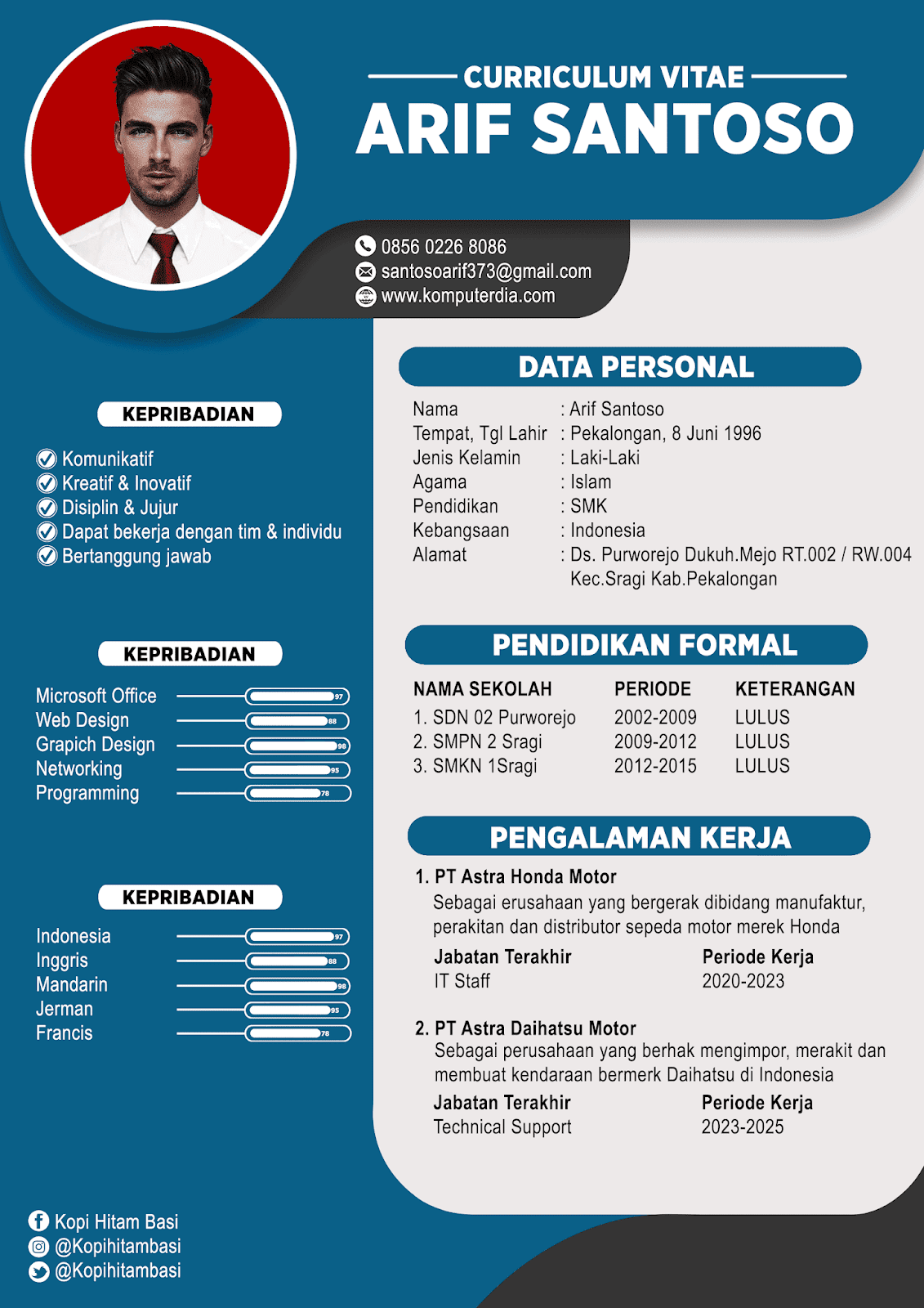 Maka dari itu, cv menjadi salah satu hal penting yang harus anda persiapkan. Nah berikut ini tim serbabisnis telah mengumpulkan beberapa contoh cv yang menarik. Membuat cv sederhana bukanlah hal yang mudah. Bagi seorang pelamar kerja, cv adalah senjata utama yang digunakan untuk menarik perhatian rekruter. Membuat cv online menggunakan pembuat cv gratis canva akan menghasilkan cv lamaran kerja yang cantik dan menarik, tanpa repot. Contoh desain cv yang menarik image result for contoh cv pro d curiculum vitae curriculum contoh cv yang kreatif by muhammad ihsan issuu 30 best photoshop psd resume cv templates photo formats 2020 cv template vectors photos and psd files free download free resume templates in photoshop psd format. Mungkin salah satunya bisa kamu tiru untuk membuat cv atau resume kamu. 12.3 mulai membuat cv yang menarik. Sebab, seseorang yang akan diterima di tempat kerja baru tidak hanya ditentukan hasil seleksi wawancara atau tes praktik saja. 12.4 baca dan cek lagi cv kamu. Pada cv terdapat identitas diri, riwayat pendidikan, karier, dan informasi lainnya. Contoh cv bahasa indonesia yang lengkap, menarik, dan kreatif cv atau curriculum vitae yang berasal dari bahasa latin yang berarti 'jalan hidup'. Lowongan pekerjaan di bank sendiri biasanya tidak mementingkan pendidikan terakhir, asalkan memenuhi kriteria yang di cantumkan di sana.